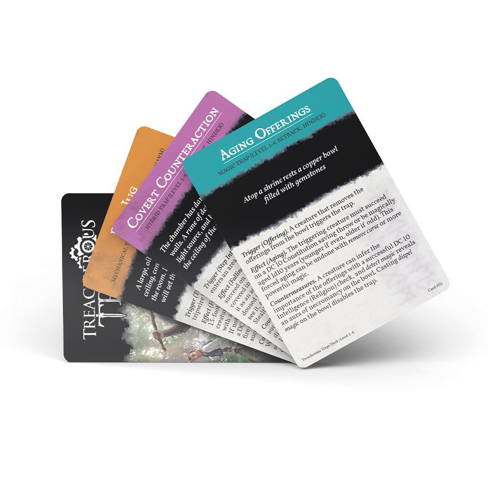 Save time while prepping or grab traps on the fly! Inside you’ll find 50 premade trap cards to challenge your level 1-4 party, ranging from minor setbacks to deadly threats.