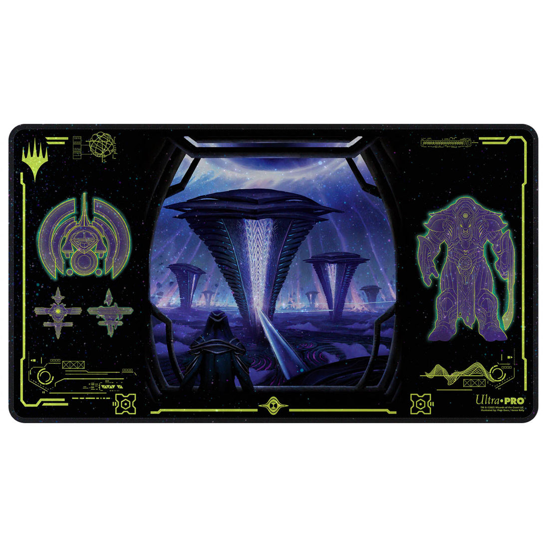 Holofoil Playmats featuring popular Magic: The Gathering artwork printed on a shimmering material with stitched edges. Made with a soft fabric top to reduce damage to cards during play and a non-slip rubber backing to keep the playmat from shifting during use, playmats enhance the gameplay experience. With dimensions of approximately 24 in. x 13.5 in., a playmat also makes an excellent oversize mousepad for home or office.
