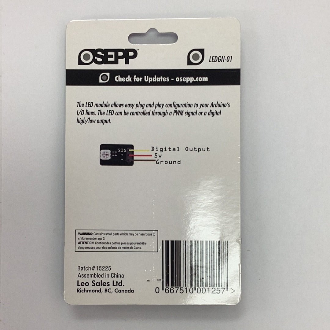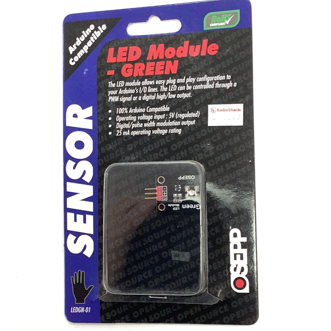 Add a vibrant touch to your Arduino projects with the Osepp Green LED Module. This 100% compatible module is easy to use with plug and play configuration. Control the LED with PWM or digital output for a custom lighting effect. Operating at 5V and 25 mA, it's perfect for your next project.