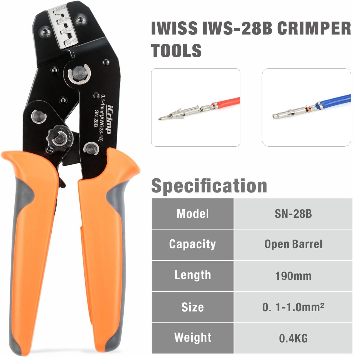 Expertly crimp non-insulated open barrel terminals with the Iwiss Crimping Tool Kit. With a 20° angled head for precision, this ratcheting tool ensures repetitive and high-quality crimps. Compatible with various pitch terminals, it's perfect for use in 3D printers, RC servos, and more. Make reliable, solderless electrical connections with ease.