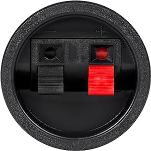 Enhance your audio system with the Parts Express Round Speaker Wire Terminal Cup. Designed for convenience and speed, the spring loaded, pushbutton terminal easily accepts up to 12 gauge stranded wire. With red and black polarity identification, this 2-15/16" round terminal cup is a must-have for any sound system.