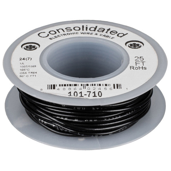 Expertly designed for efficiency and quality, the Consolidated Stranded 24 AWG Hook-up Wire provides a convenient 25 ft. spool for all your electrical needs. Its stranded construction and color-coded PVC insulation ensure reliable performance in temperatures ranging from -40° to +105° C. Plus, its tinned copper conductor guarantees maximum conductivity. Made in the USA.