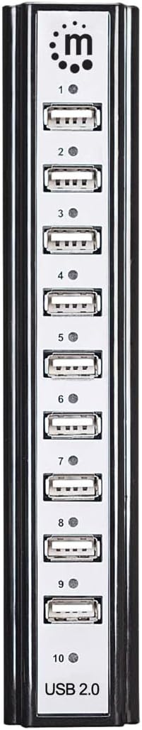 The Manhattan HI-Speed USB Desktop Hub features 10 ports for various peripherals, providing a compact and efficient design. It also offers overcurrent protection and hot-swapping capabilities. With compatibility for all USB-equipped computers and transfer speeds up to 480 Mbps, this hub is a reliable and versatile choice for charging and connecting devices.