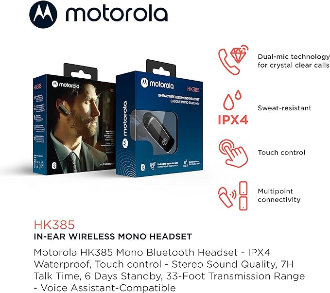 Experience the perfect combination of convenience and functionality with the Motorola Sound HK385 wireless headset. Its built-in microphone and touch/voice controls make answering calls a breeze. With IPX4 water resistance and a 7-hour battery life, stay comfortable and connected for all-day use. Includes three sizes of soft ear caps for a tailored fit.