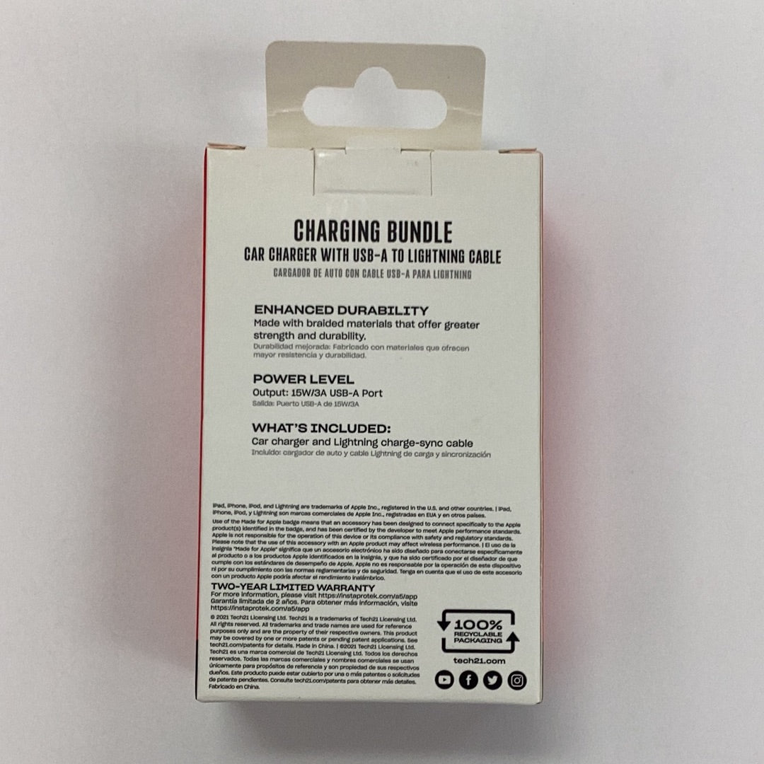 Boost your car's charging capabilities with the Tech 21 Apple Car Charging Bundle. Featuring a 4ft USB-A to lighting cable, this bundle provides fast and efficient charging for your Apple devices while on the go. With a powerful 15 watt output, you can quickly and safely charge your devices without any hassle. Say goodbye to low battery anxiety and stay connected with Tech 21.